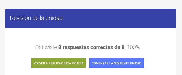 Una vez que completes todos los apartados de la unidad, tendrás una revisión final de la unidad, en la que pondrás a prueba tus conocimientos de lo tratado. Esta revisión final de unidad tiene un formato tipo test y cuenta entre 4-10 preguntas generalmente.