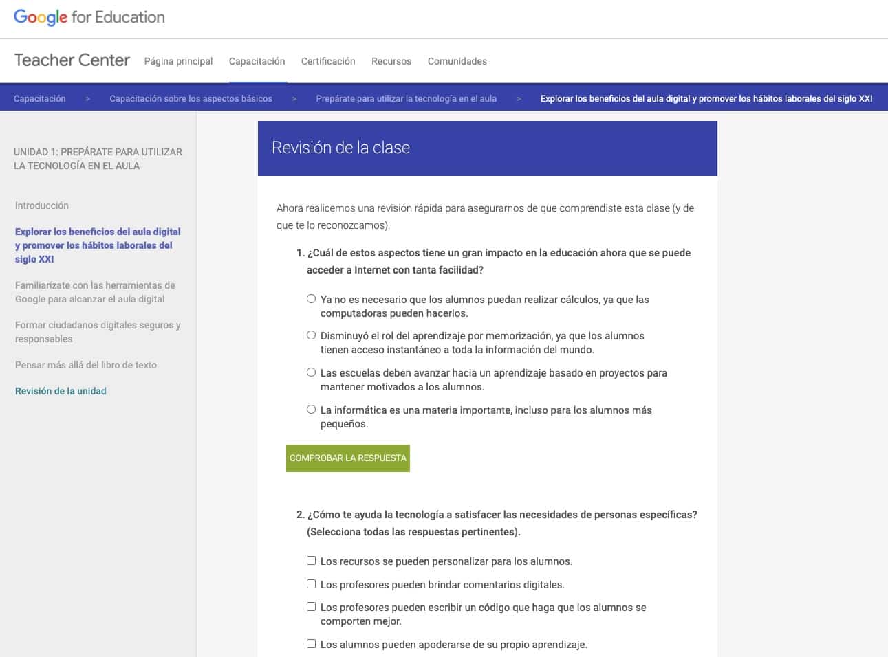 El formato del curso de capacitación del Educador Certificado de Google nivel 2, es exactamente el mismo que el de nivel 1: Cada lección cuenta con ciertos temas de los que formarse, ya sea leyendo algún texto, viendo algún video o realizando alguna pequeña actividad. Al final de cada tema, hay una pequeña revisión de 4 preguntas tipo test. Cuando termines una unidad, tendrás que hacer una revisión de la unidad, con unas cuantas preguntas tipo test. Así, hasta completar todas las unidades.